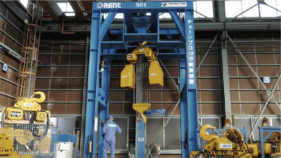 レントは、お客様の安全な作業のために、保有するレンタル機械を適切に点検整備することはもちろんのこと、お客様が保有するチェーンブロックやジャッキ類についても点検・定格荷重負荷試験を承ります。