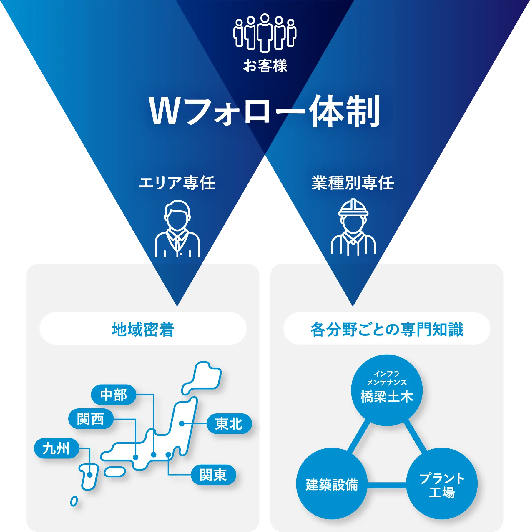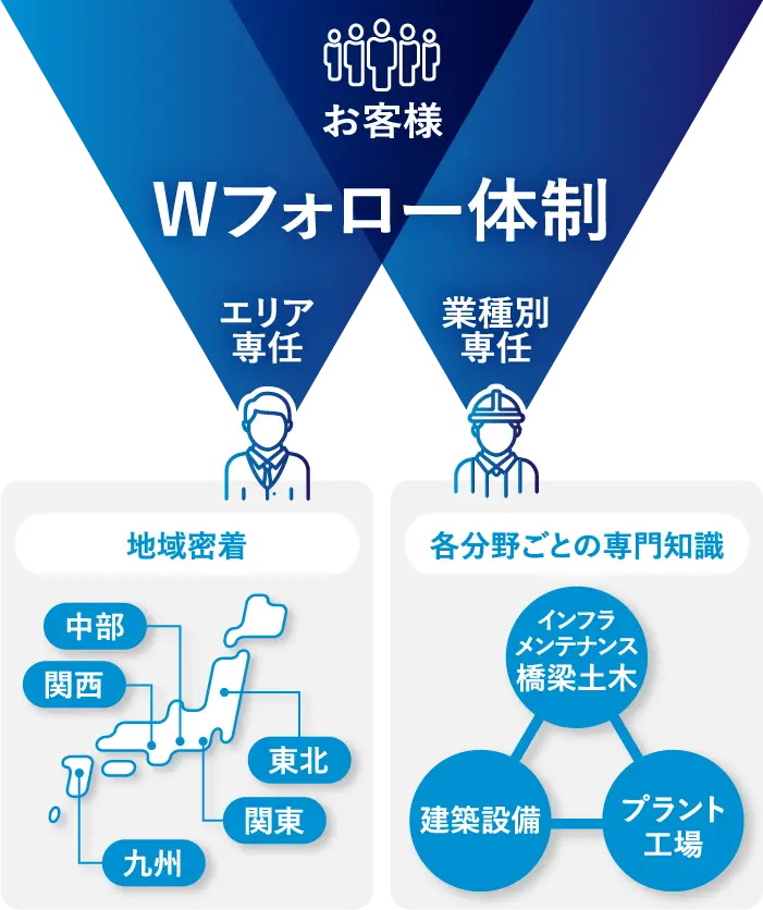 全国の営業拠点に所属する営業担当とは別に、特定の商品分野・業界事情に精通した広域営業部門を設け、社内横断的に連携のうえ、お客様のご対応をおこないます。