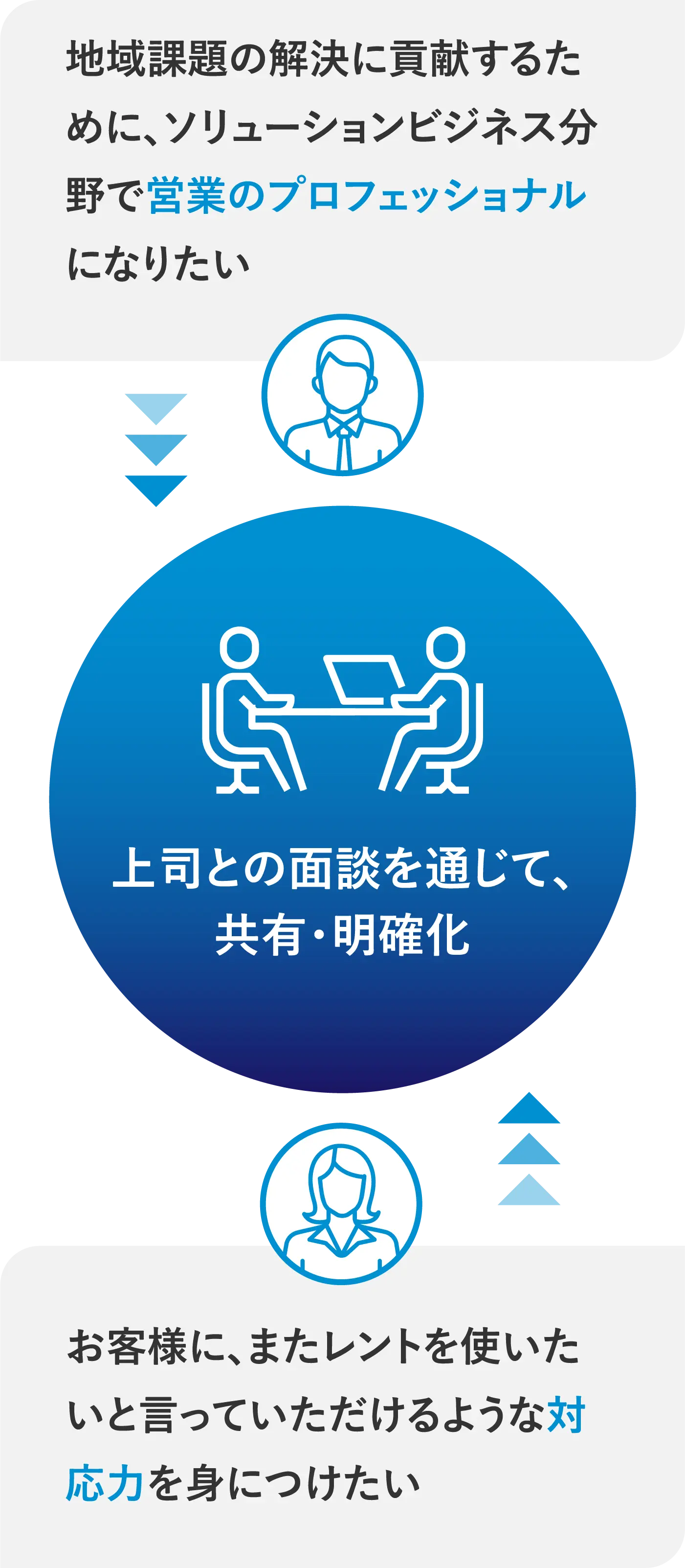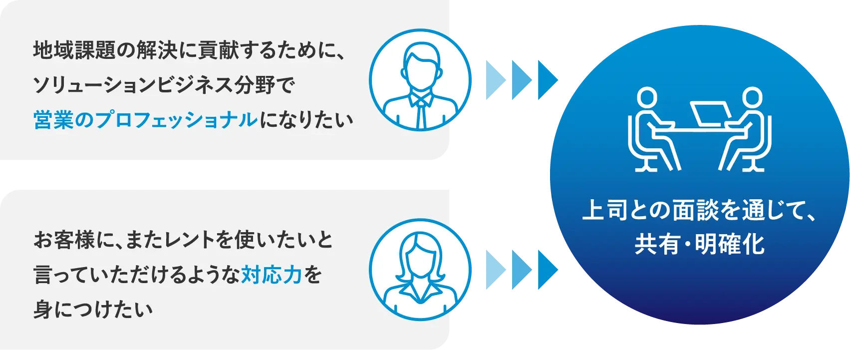 社員の自己実現に向けて、社員と会社は共にキャリアを描き、共に実現する「パートナー」であると考え、全面的なサポートをおこないます。具体的には、定期的に実施するキャリア面談等を通じてキャリアをより具体化し、必要なスキル・実践力を研修や通信教教育等によって習得できるよう設定し、さらに社員のキャリアに応じた実践機会(活躍の場)を提供するなど、キャリアデザインをしっかりとサポートします。