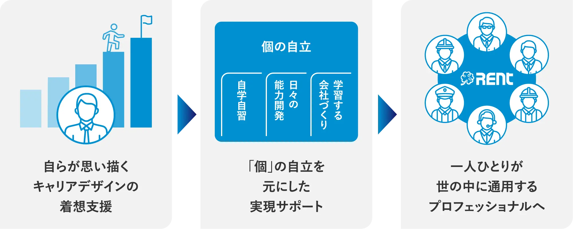 社員自らが、キャリアを描き、スキル・実践力を高め、自己実現に繋げることが、社員一人ひとりの「働き甲斐」や「エンゲージメントの向上」に繋がり、レントグループの事業を支える源になると考えています。