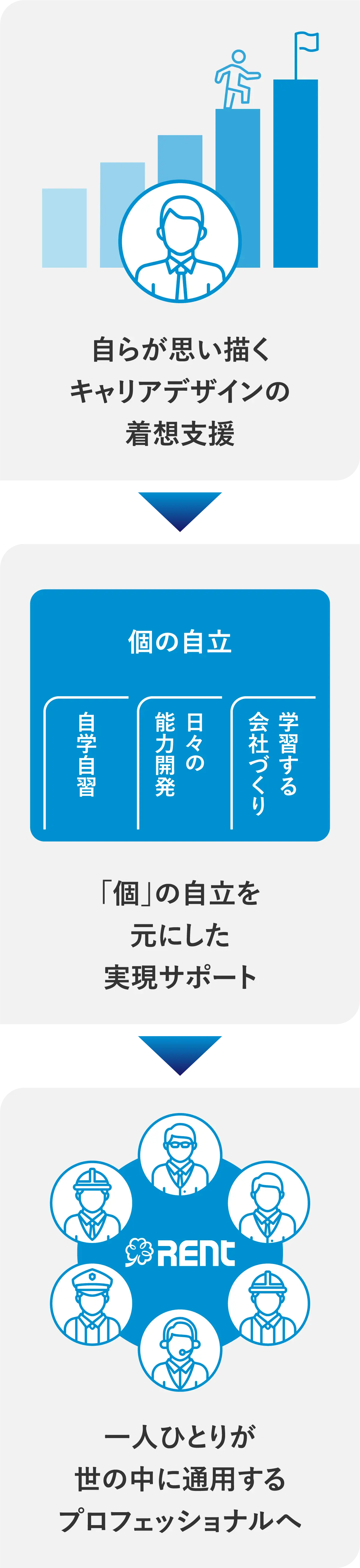 レントでは「個」の自立がプロフェッショナルへの成長の原点と考え、会社主導のキャリア開発や研修のみでなく社員一人一人が思い描くキャリアデザインに沿って成長できる環境づくりを行っています。