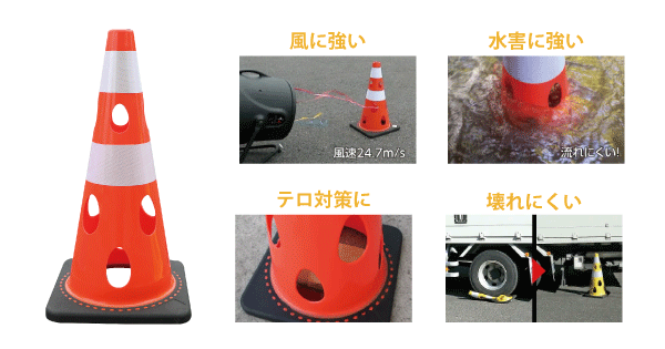 コーンの穴により風・水の抵抗を軽減します。壊れにくいPVC素材。ライトなどのオプションが取り付け可能なリニューアル商品です。