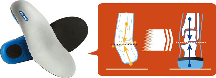 インソールの装着で踵の骨の傾きを改善。リンク先でメカニズムや実験動画をご覧いただけます。