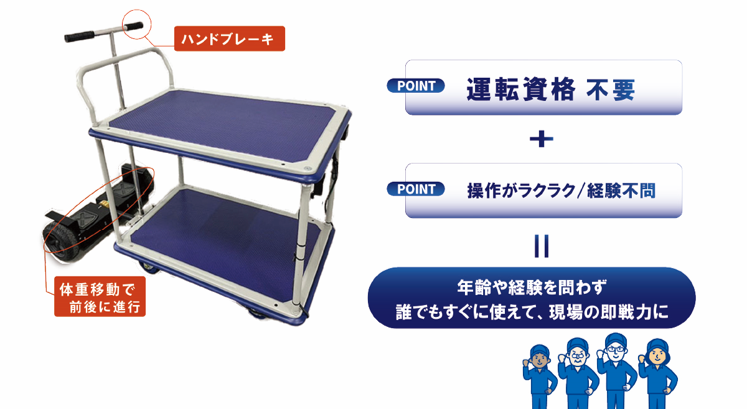 スマートキャリーは、セグウェイ技術を活用した次世代台車です。 歩行負担を最大40%軽減し 移動をスムーズにすることで現場作業を効率化!! 操作が簡単だから 年齢や国籍を問わず誰もが戦力になれるソリューションツールです。